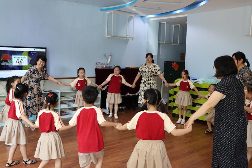 随后,全体人员来到教室。孩子们看到老师们到来,热情地打招呼,争先恐后地展示自己的才艺和技能。大家与小朋友们手拉手跟随音乐跳舞互动,“蓝蓝的天空银河里有只小白船……”“蜗牛背着那重重的壳呀,一步一步地往上爬……”,稚嫩的歌声中充满着童趣,欢乐的声音洋溢在整个教室内外。离开前,党员们把教室里的课桌板凳擦拭干净,将学习用品、玩具摆放整齐,为孩子们营造了整洁、卫生的学习环境。