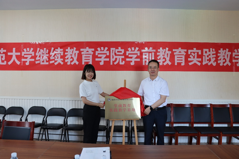 学前教育实践教学基地”授牌仪式,学院党总支书记茌淑君致辞中强调在儒韵宝贝幼儿园设立实践教学基地,是为了加强学前教育专业建设,提升幼儿园教师的实践能力,希望今后学院与儒韵宝贝幼儿园有更多更广的交流和合作。王芳表示,基地的设立有助于提高幼儿园的教育教学质量,推动规范办学,努力做让全社会满意的幼儿园。