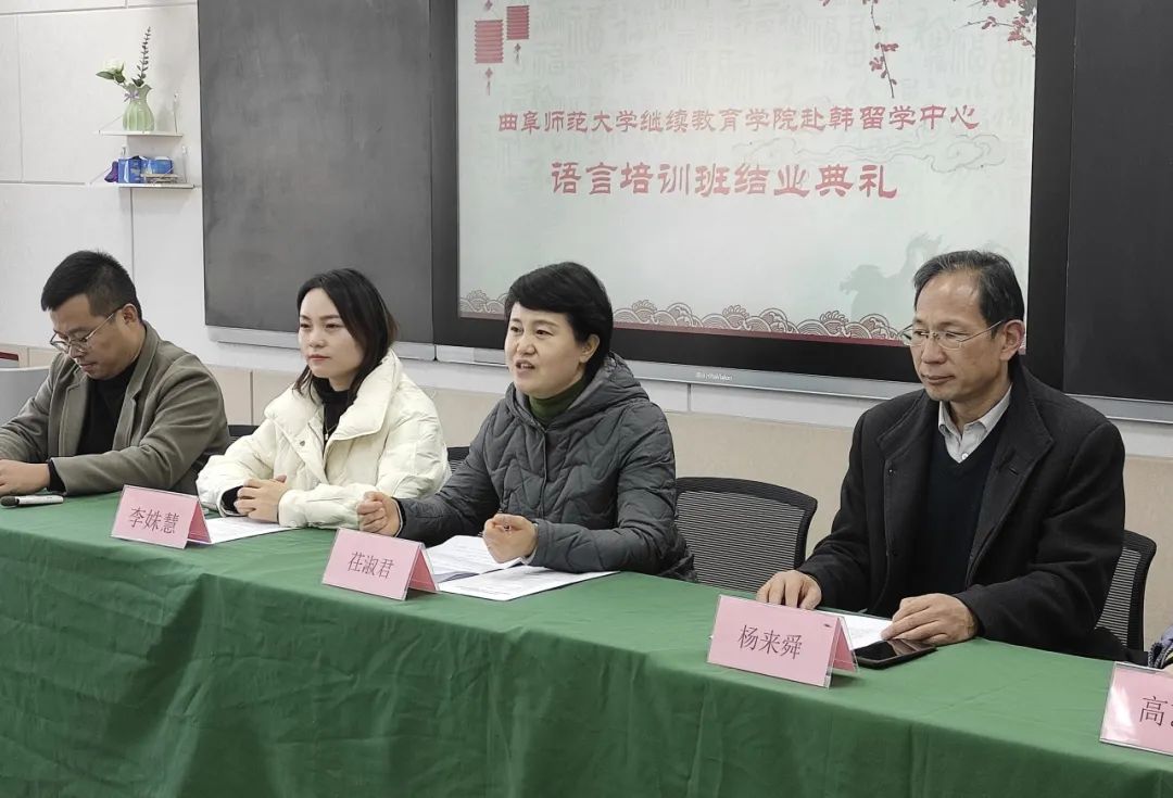 茌淑君致辞对同学们未来在韩国的学习与生活提出了三点要求:一是进入全新的学习生活环境后一定要养成良好的生活习惯和学习习惯,加强锻炼,生活上作息要规律,保持良好的身体素质;二是时刻谨记安全第一,加强自我保护意识;三是建立自信,全新的环境一定会有诸多的不适应,要调整好心态,保持乐观积极的生活、学习态度,乐于助人,互帮互助。在祝贺同学们的语言培训顺利结束同时,祝愿参与赴韩国留学本科项目的同学们再接再厉,在接下来的韩国大学生活中收获更大的进步,成为更好的自己!