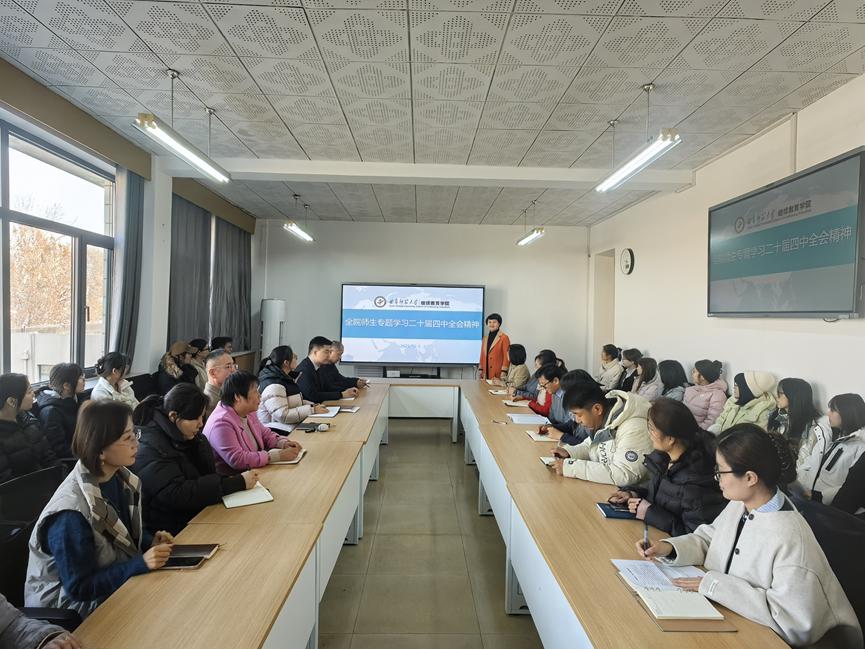 为深入学习贯彻党的二十届四中全会精神,准确把握其核心要义与实践要求,引导广大师生切实把思想和行动统一到中央决策部署上来,根据学校党委统一安排,12月5日上午,学院召开专题学习二十届四中全会精神。会议由学院党总支书记茌淑君宣讲。