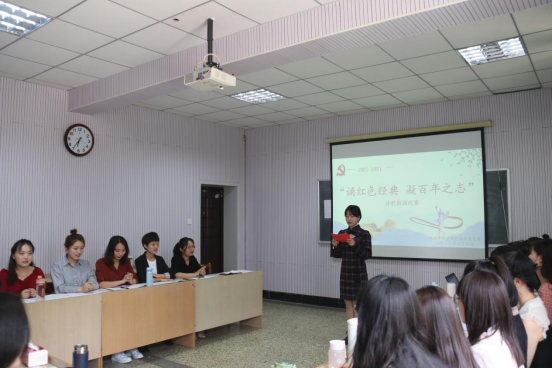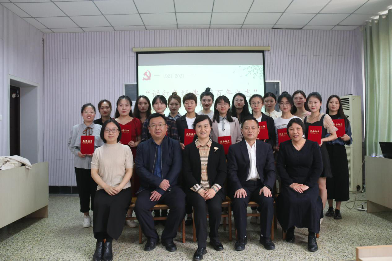 主持人徐冰宣读完竞赛办法后,16名同学按照赛前抽签顺序依次进行比赛。参赛同学紧紧围绕“建党100周年”这一主题,回顾了百年来中国共产党的光荣历史,声情并茂地讴歌了党的光辉业绩和感人事迹,以饱满的热情抒发了对党的无限热爱与崇敬之情,表达了肩负时代重任、建设美好未来、实现中华民族伟大复兴的坚定信念。整场比赛精彩纷呈,气氛热烈。《祖国啊,我亲爱的祖国》《七月的天空》《为党歌唱》《以党为荣,以国为傲》等16个朗诵作品表达了学子们的爱党之心和强国之愿。经过激烈角逐,徐冰、于奕雯获得一等奖,王思瑶、郭存等6名同学获得二等奖,李祥敏、马俊丽等8名选手荣获三等奖。最后,评委老师为获奖同学颁奖,全体人员合影留念。