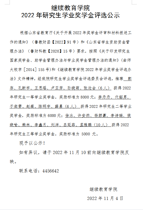 酷爱成人网 2022年研究生学业奖学金评选公示