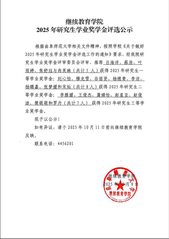 酷爱成人网 2025年研究生学业奖学金评选公示